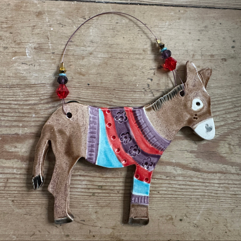 This jolly donkey is handcrafted from clay, fired, and adorned with co-ordinating glass beads and crystals before being strung on wire. Each piece is one-of-a-kind, so there may be slight variations from the photo. Though we strive for accurate colour depiction, screen colours may vary on different devices.