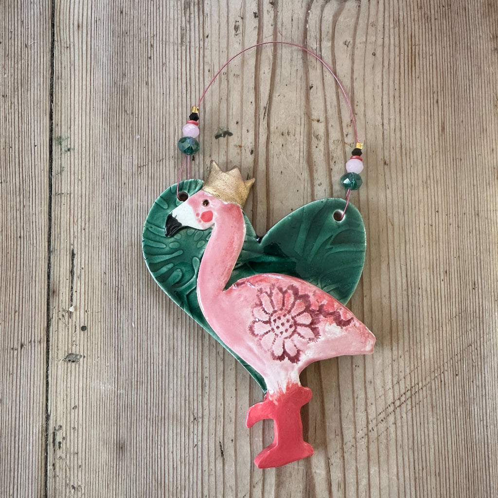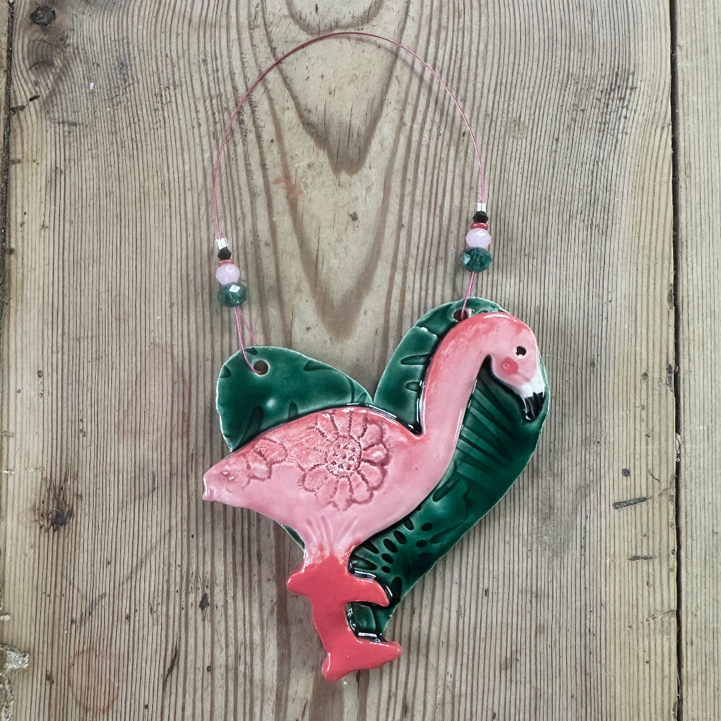 This funky flamingo  is carefully hand-cut from clay, then fired and glazed on both sides. It’s strung on wire adorned with matching glass beads and sparkling crystals. Every piece is one of a kind, so your flamingo will be slightly different from the photo. Colours may vary slightly due to screen differences.