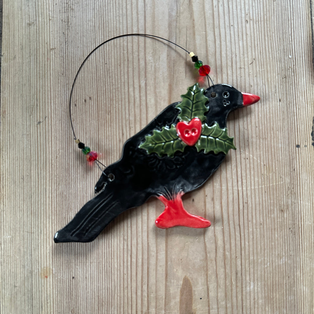 This charming Cornish Chough is hand cut from clay, fired, glazed and then strung on wire with colour co-ordinating glass beads and crystals. Each one is unique so will not be identical to the photograph shown. While best efforts are made to give accurate colour representation, screens differ across every device.