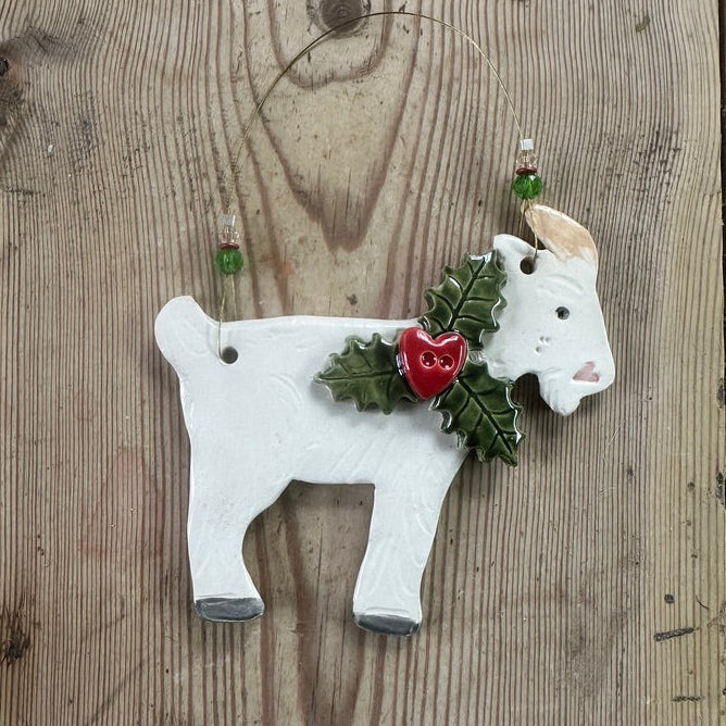 Meet your new favourite decoration! This charming goat is lovingly hand-carved from clay, kiln-fired, and finished with a glossy glaze. Suspended on wire and embellished with matching glass beads and twinkling crystals, it's a playful addition that brings personality and warmth to any room.