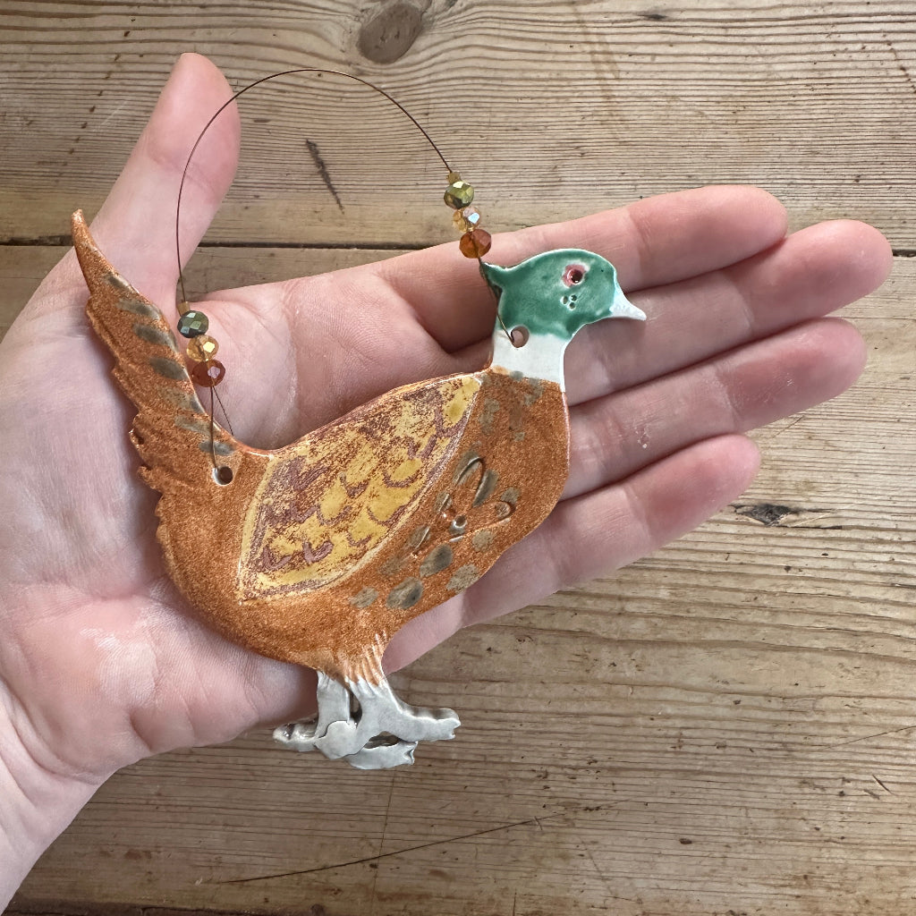 This pheasant is hand cut from clay, fired, glazed on both sides and then strung on wire with colour co-ordinating glass beads and crystals. Each one is unique so will not be identical to the photograph shown. While best efforts are made to give accurate colour representation, screens differ across every device.