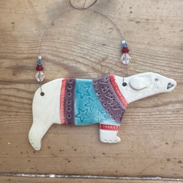 This charming polar bear is carefully hand-cut from clay, fired, glazed, and adorned with matching glass beads and crystals, all strung on wire. Each piece is made to order, with custom creations typically taking up to 3 weeks because of kiln firing times. Feel free to reach out for a more accurate delivery estimate!