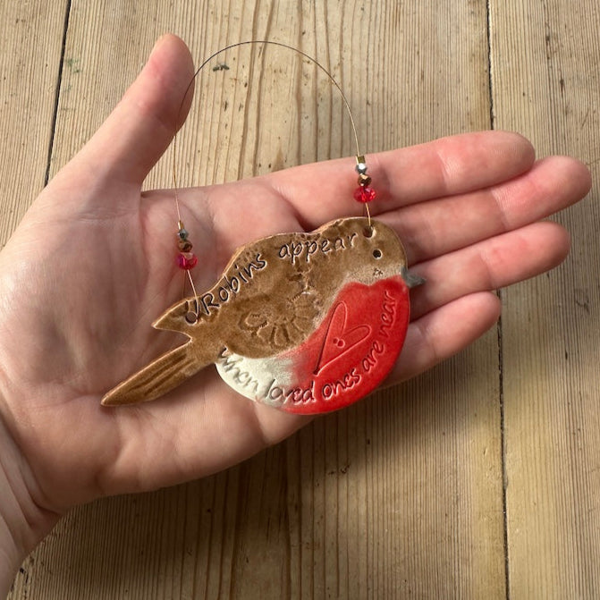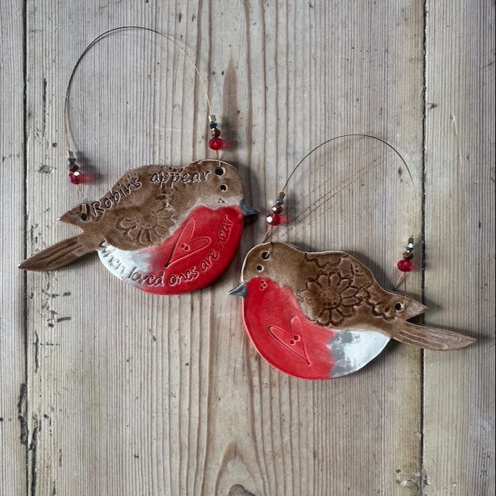 This charming robin is individually hand-cut from clay, fired, and glazed on both sides before being strung on wire adorned with matching glass beads and crystals. Each piece is one-of-a-kind, so your robin will be unique and may differ slightly from the photo. While every effort is made to show accurate colours, they may vary depending on your device. Made-to-order items typically take up to 3 weeks due to kiln firing schedules. Feel free to contact me for a more exact timeframe.