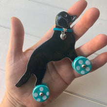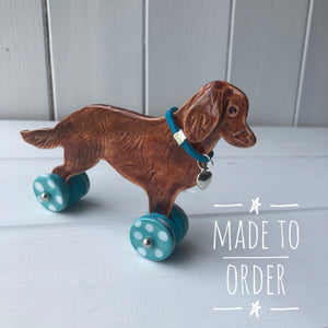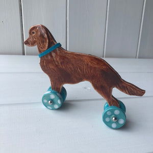 A beautiful handmade Flat Coated Retriever dog on wheels, affectionately known here as Woof on Wheels. A house-trained dog decoration ready to roll off to a lovely new home. Perfect for a dog lover, dog mum, Flattie lover, or as a memorial for your beloved hound. Everyone will fall for this darling dog model.