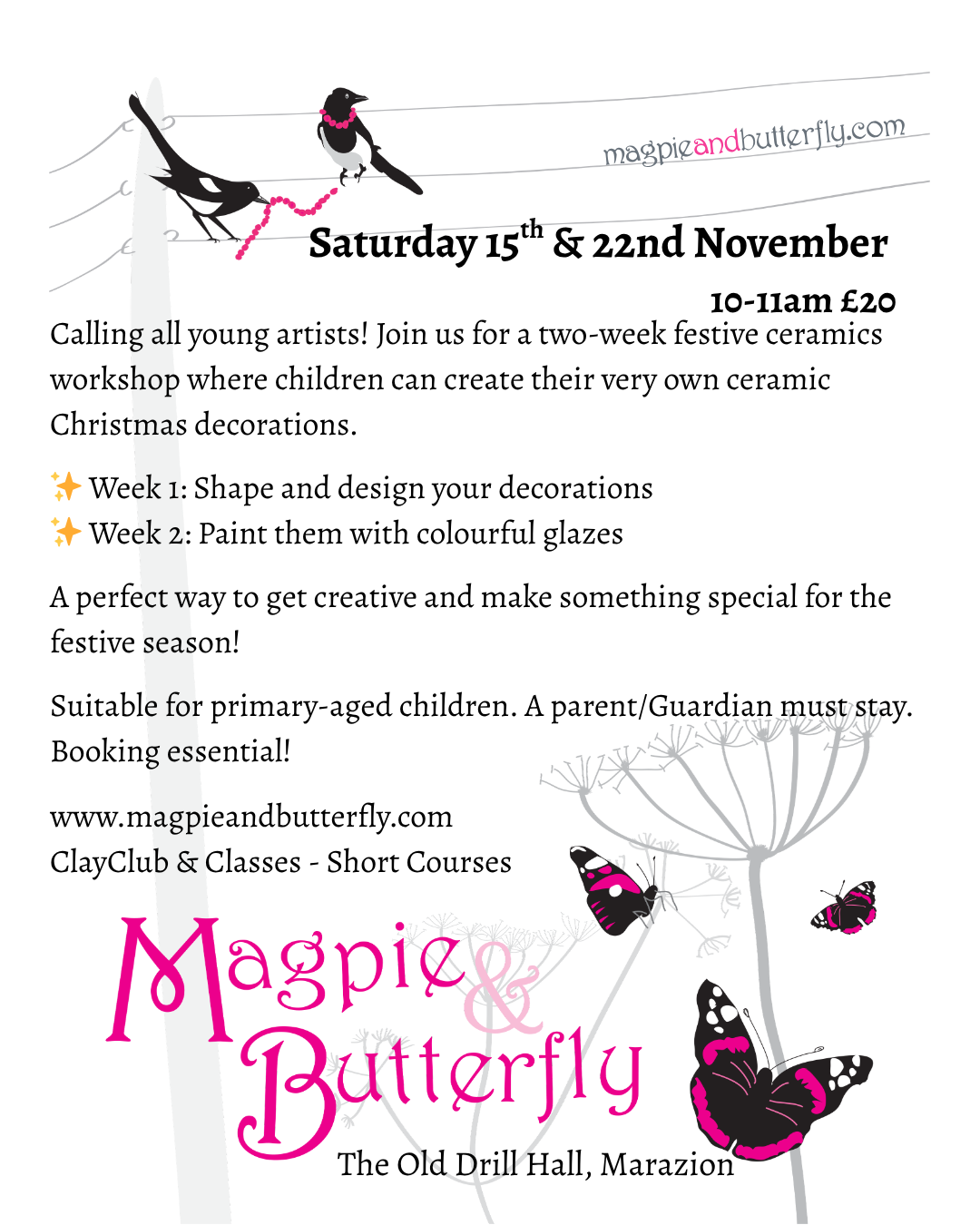 Come and join me in my studio to make your own one-of-a-kind ceramic decorations for any occasion including Christmas, Easter, and celebrating new arrivals or words of wisdom! In just two weeks, you'll get to design, shape, and glaze your decorations before they're fired with prayers to the kiln gods. Don't miss out on creating your own special decorations! You only need a curiosity for clay and ceramics. No experience needed. All materials included (you are welcome to bring your own cookie cutters, stamps etc). Theres also teas, herbal teas, coffee and biscuits